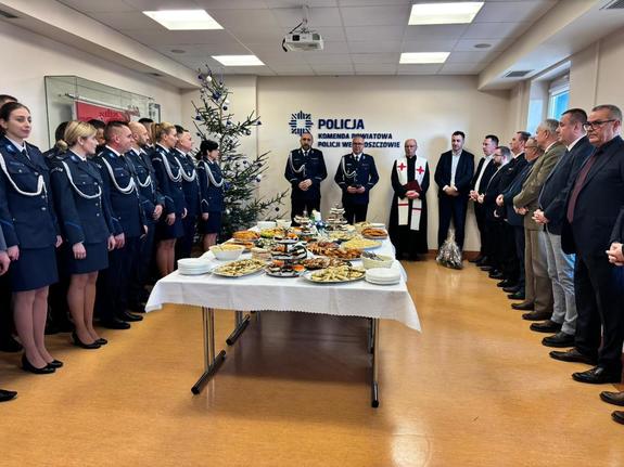 Dzisiaj w sali narad Komendy Powiatowej Policji we Włoszczowie odbyło się uroczyste spotkanie wigilijne, w którym uczestniczyli policjanci i pracownicy włoszczowskiej komendy oraz zaproszeni goście. Zgodnie z tradycją podzielono się opłatkiem i złożono sobie życzenia świąteczne.