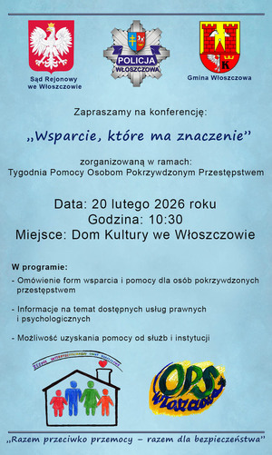 W ramach Tygodnia Pomocy Osobom Pokrzywdzonym Przestępstwem Komenda Powiatowa Policji we Włoszczowie wspólnie z Sądem Rejonowym we Włoszczowie oraz Zespołem Interdyscyplinarnym Gminy Włoszczowa organizuje konferencję poświęconą tematyce wsparcia dla osób pokrzywdzonych przestępstwem. Wydarzenie to odbędzie się w piątek 20 lutego o godz. 10:30 w Domu Kultury we Włoszczowie.