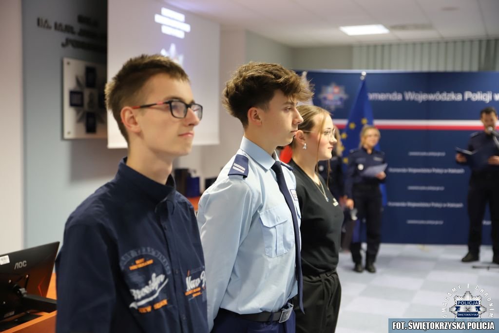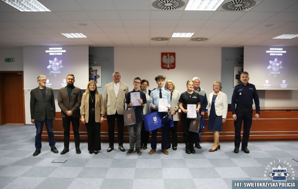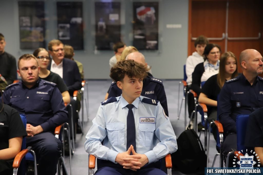 Tydzień później na tej samej sali zebrali się wyróżnieni uczestnicy konkursu, przedstawiciele szkół, urzędów oraz świętokrzyskiej Policji aby podsumować rywalizację. Była to także okazja, by wspólnie uczcić tradycję formacji, która od 106 lat stoi na straży bezpieczeństwa i porządku publicznego. Podczas uroczystości obecni mogli wysłuchać wykładu o początkach obecności kobiet w Policji – w tym roku przypada setna rocznica tego pięknego jubileuszu. Tą wiedzą wykazali się najlepsi uczestnicy konkursu, wśród których znajdowali się policjanci i uczniowie.
