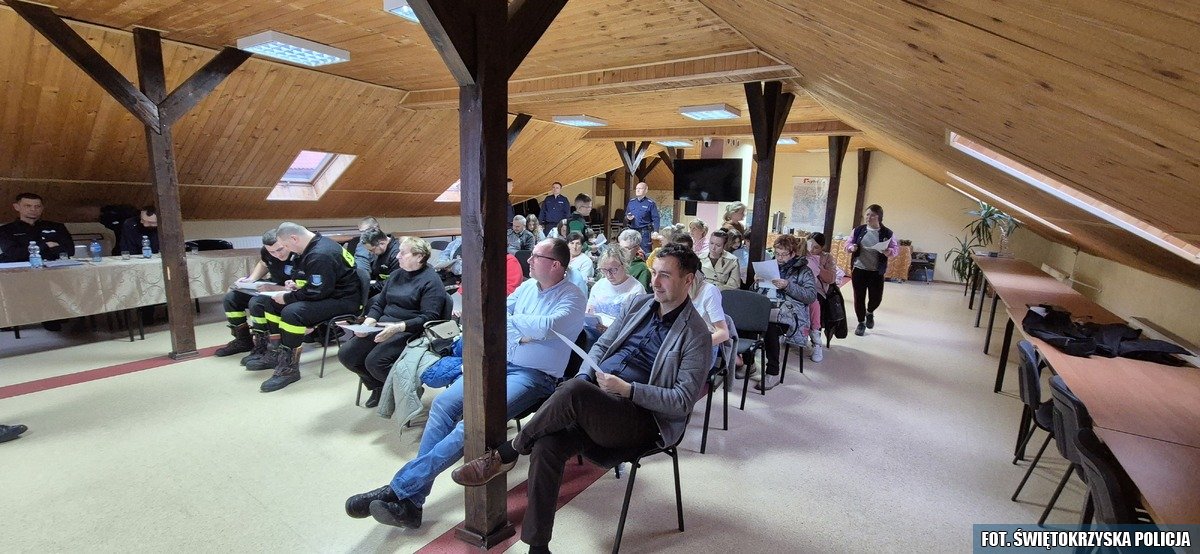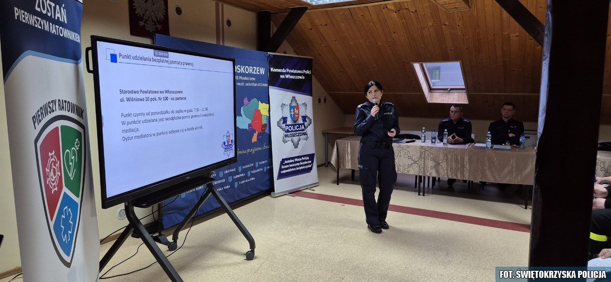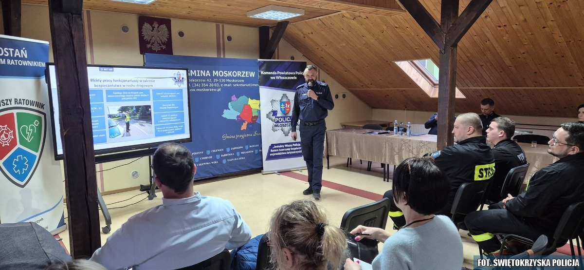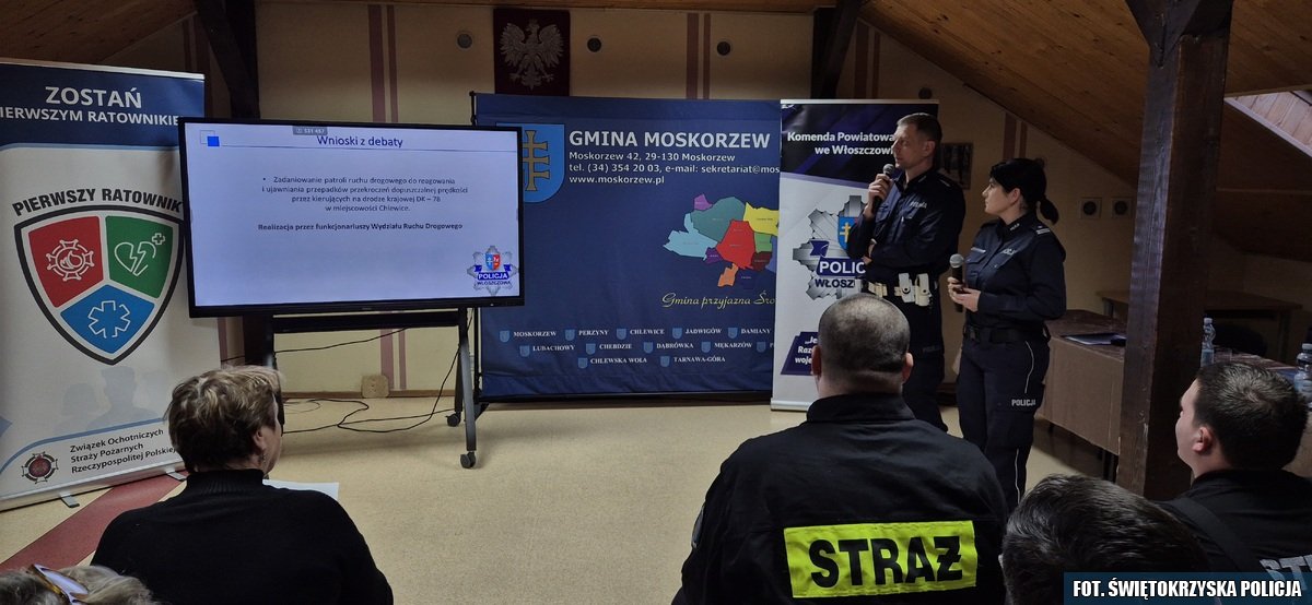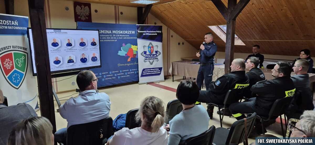 Dzisiaj włoszczowscy policjanci spotkali się z mieszkańcami gminy Moskorzew. Podczas zorganizowanego spotkania omówione zostały aspekty związane ze stanem bezpieczeństwa powiatu włoszczowskiego, funkcjonowaniem Krajowej Mapy Zagrożeń Bezpieczeństwa, bezpieczeństwa w ruchu drogowym, profilaktyką dotyczącą oszustw oraz pomocy osobom pokrzywdzonym przestępstwem.