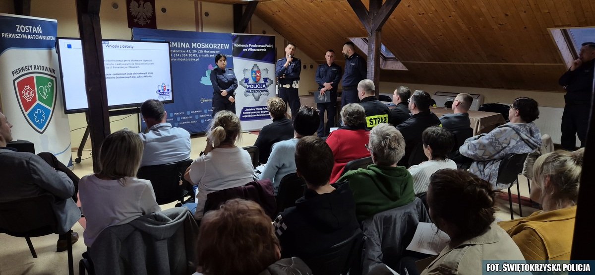 Dzisiaj policjanci z Komendy Powiatowej Policji we Włoszczowie zorganizowali dla mieszkańców gminy Moskorzew podsumowującą debatę społeczną pod nazwą „Porozmawiajmy o bezpieczeństwo – Możesz mieć na nie wpływ”. Głównym tematem zorganizowanego spotkania było szeroko rozumiane pojęcie bezpieczeństwa. Podczas wydarzenia omówione zostały aspekty związane ze stanem bezpieczeństwa powiatu włoszczowskiego, a także funkcjonowaniem Krajowej Mapy Zagrożeń Bezpieczeństwa. Nie zabrakło również informacji związanych ze służbą dzielnicowego, profilaktyką dotyczącą oszustw, dostępnych form pomocy dla osób pokrzywdzonych przestępstwem, a także bezpieczeństwa w ruchu drogowym.